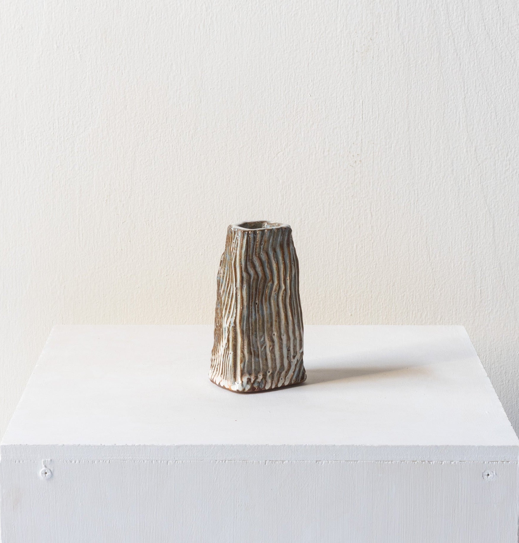 Mini wavy vase. Asymmetrical ceramic vase with wavy patterned surface texture. White glaze on red stoneware. Built by hand in Brooklyn, NY.